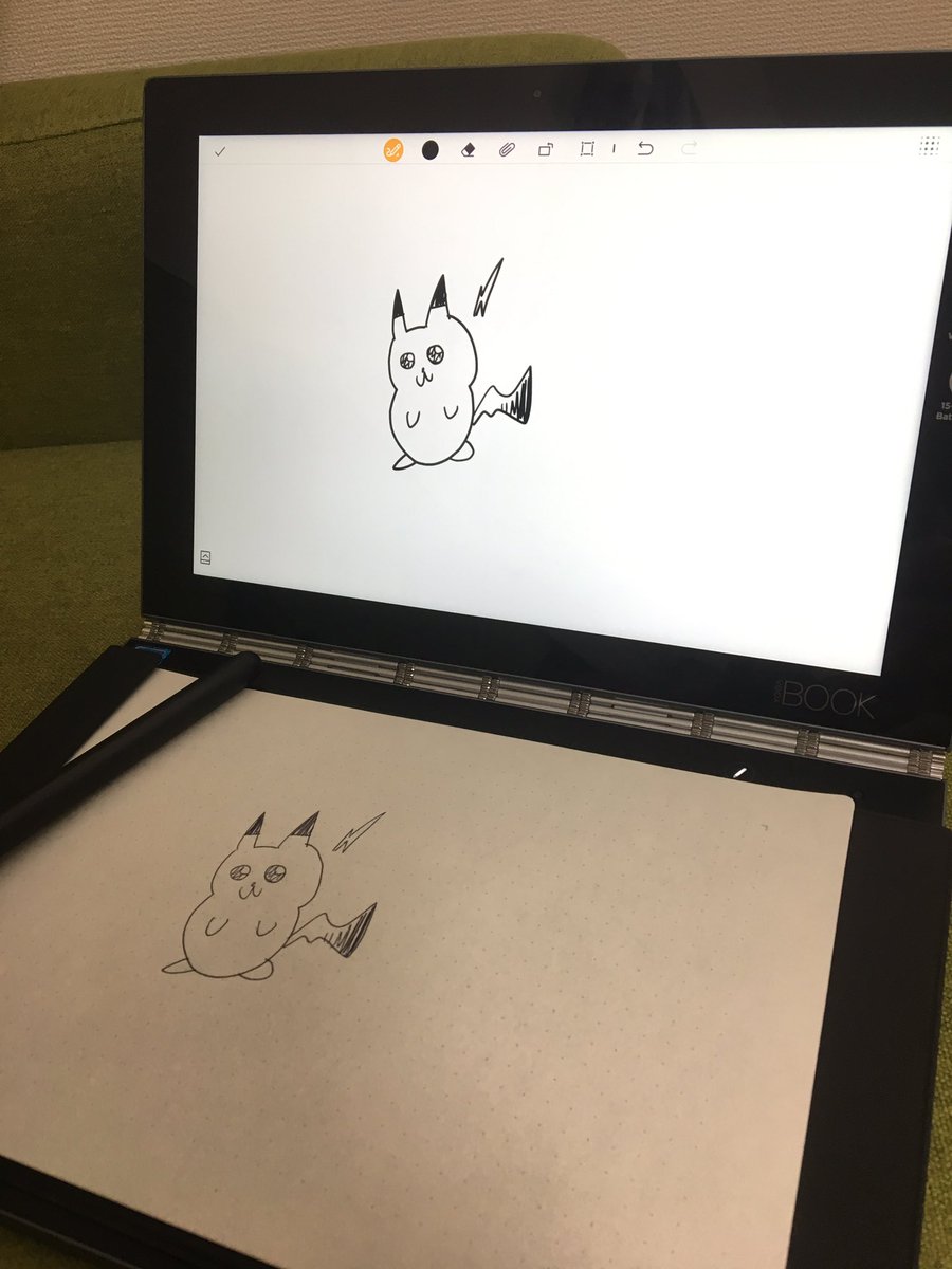 リアルペンを搭載した #YOGABOOK なら、BOOK PAD上に置いた紙に直接絵や文字を書くと、同時にスクリーン上にも表示され、画像ファイルやPDFでのデータ保存が可能!